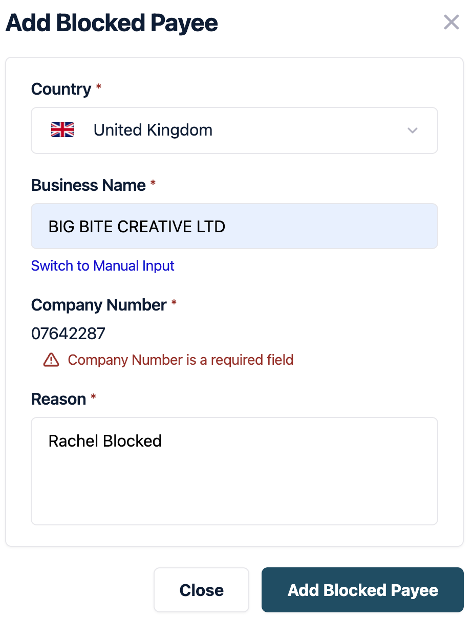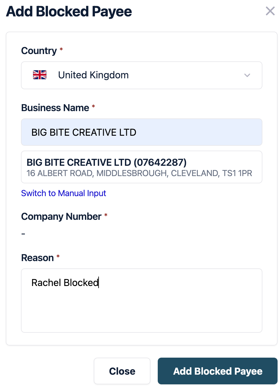 Populate the Name, Company Number and Reason. You must include the company number, once you have added the name, the system will provide options of the company details. Once selected it will populate the company number. To confirm changes click ‘Add Blocked Payee’.