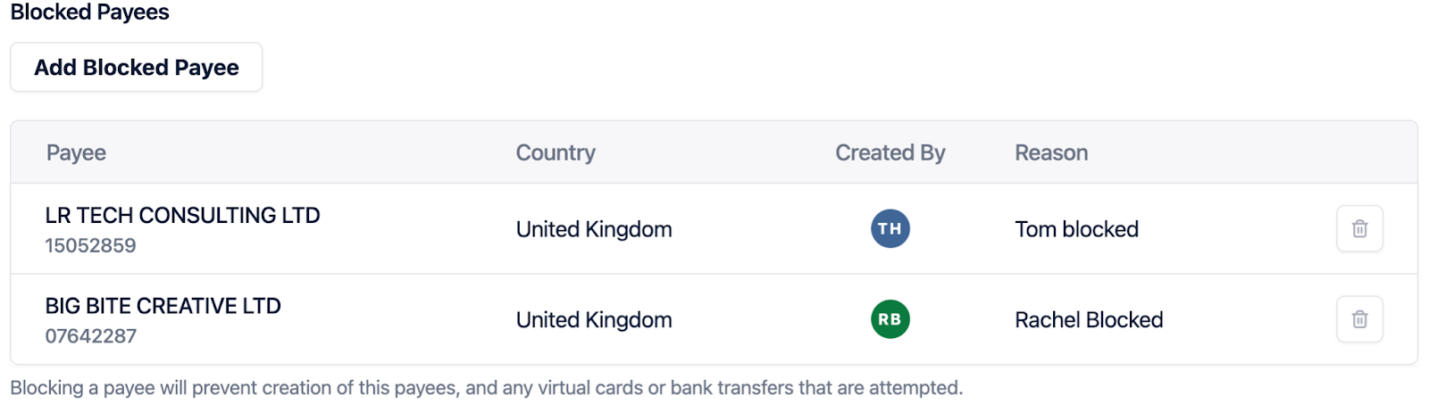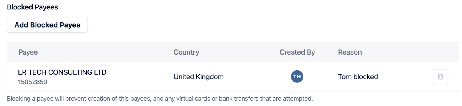 By blocking a payee by company allows you to: Prevent unauthorised or high-risk vendors from receiving payment. Enforce procurement or compliance rules. Ensure teams only pay approved suppliers.