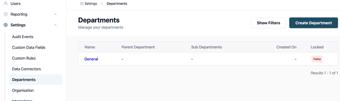 1. Using the menu on the left hand side select settings and from there select ‘Departments’ from the drop down.
