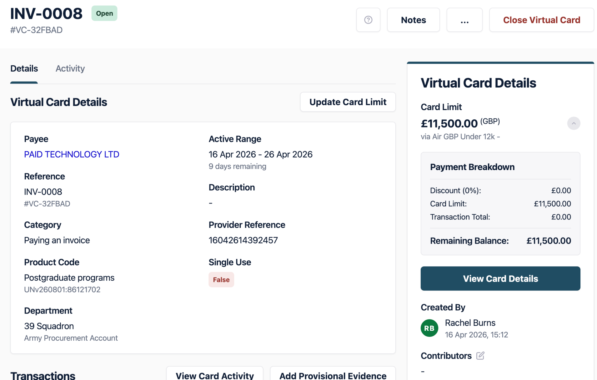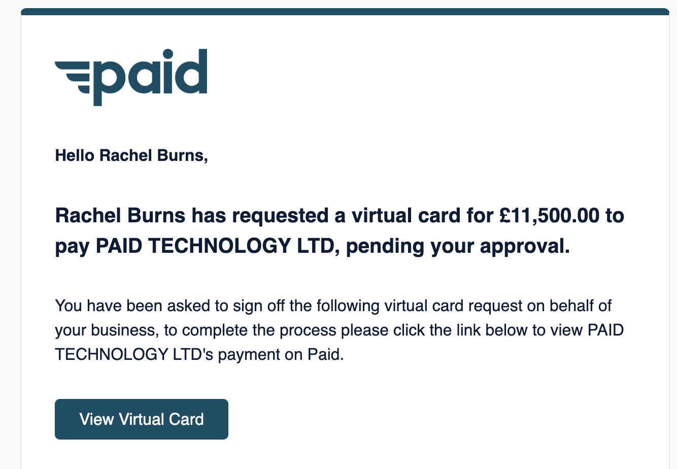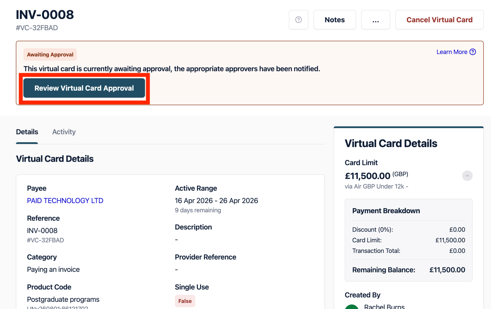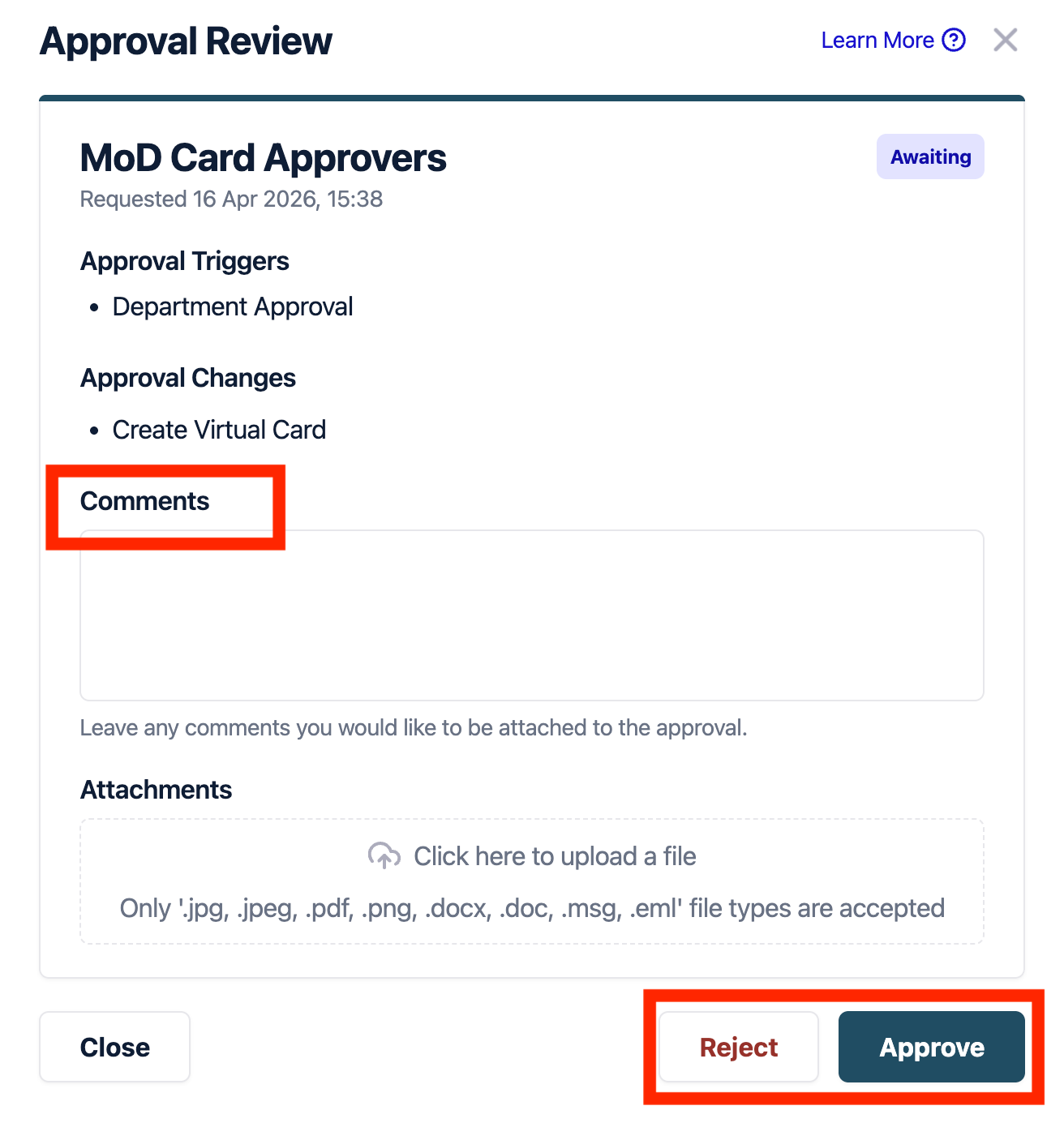 This guide explains how to review and approve a virtual card, if also explains how to reject a card, where appropriate.