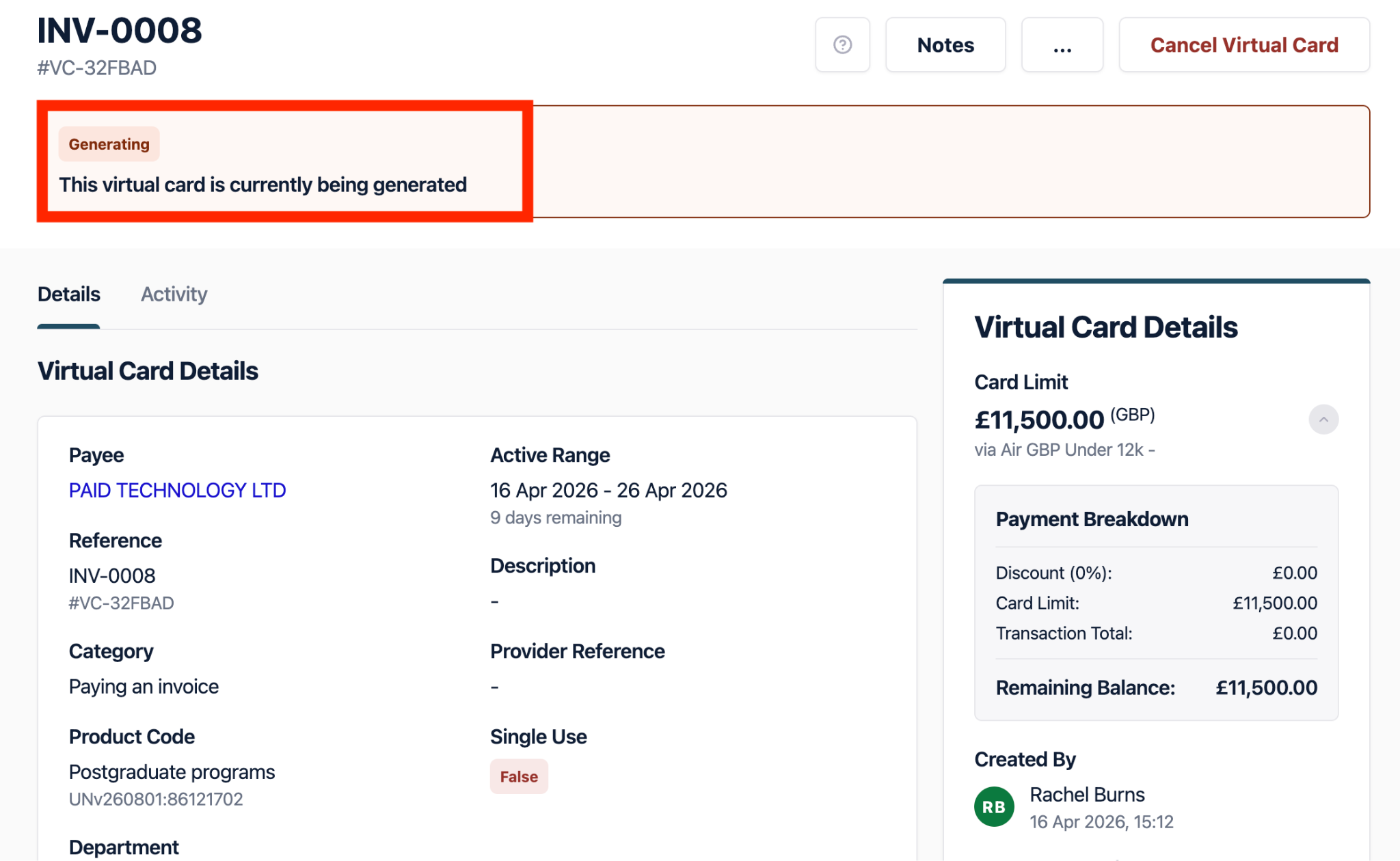 4. Once you have approved the virtual card you will see that the card is momentarily being generated.