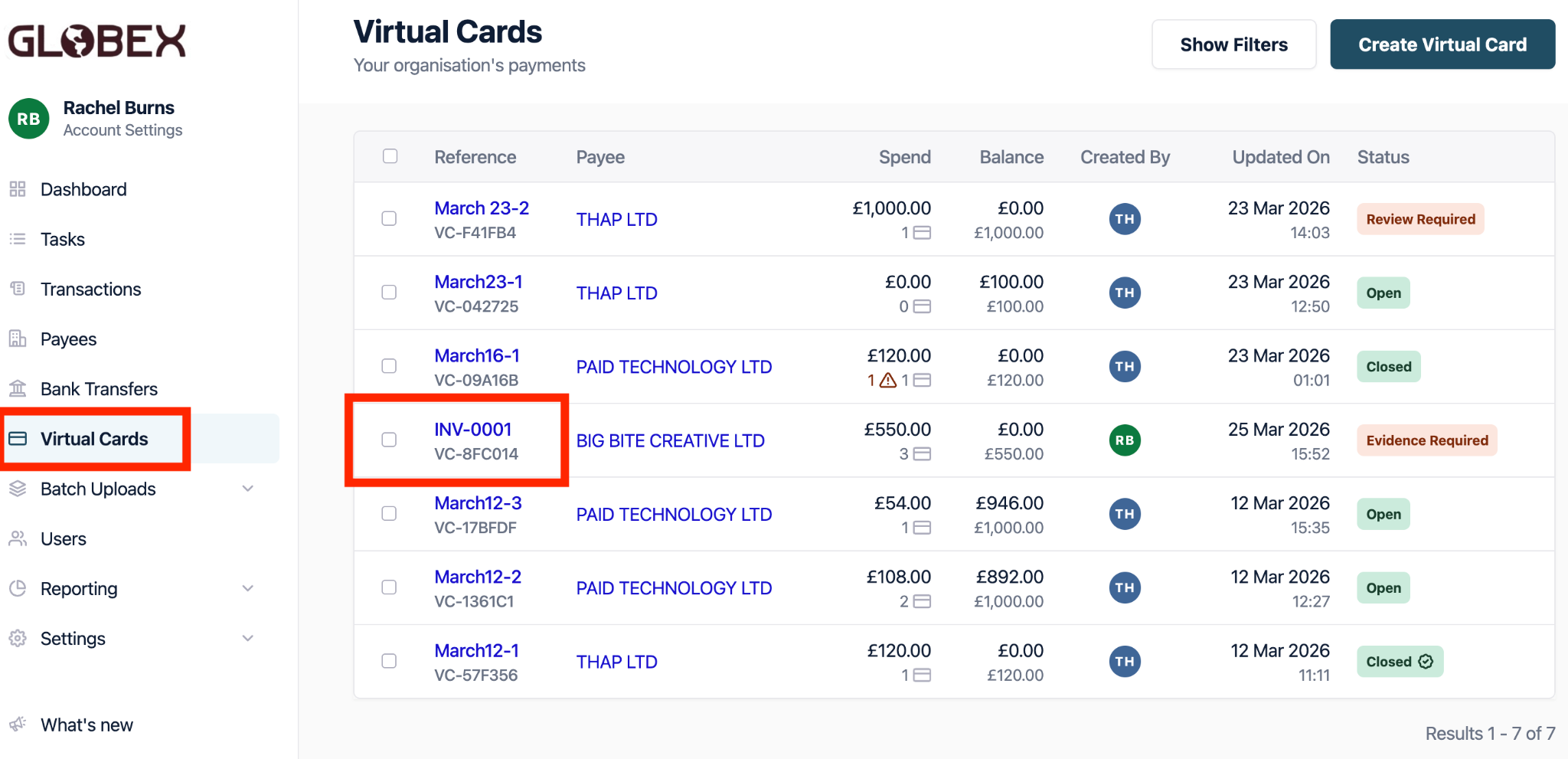 1. Log into your account from the dashboard, from the left hand side menu select ’Virtual Cards’ . From there you will need to click into the card that you would like to view the activity of.
