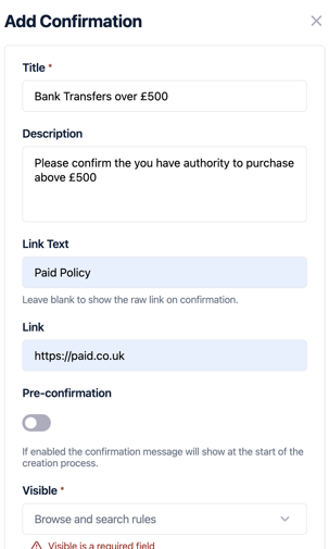 4) From here select “Add Confirmation”, a pop out box will appear on the right hand side of the screen;