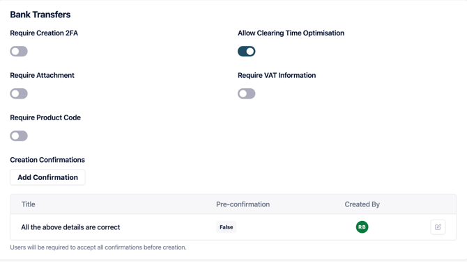 Confirmation messages are used during Bank Transfer creation to ensure users acknowledge specific rules or provide final verification before completing a transaction.