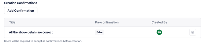Example: A pre-confirmation might ask the user: "Do you abide by all of our rules before you create the virtual card?"