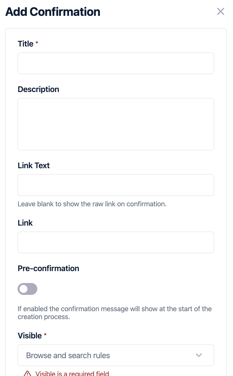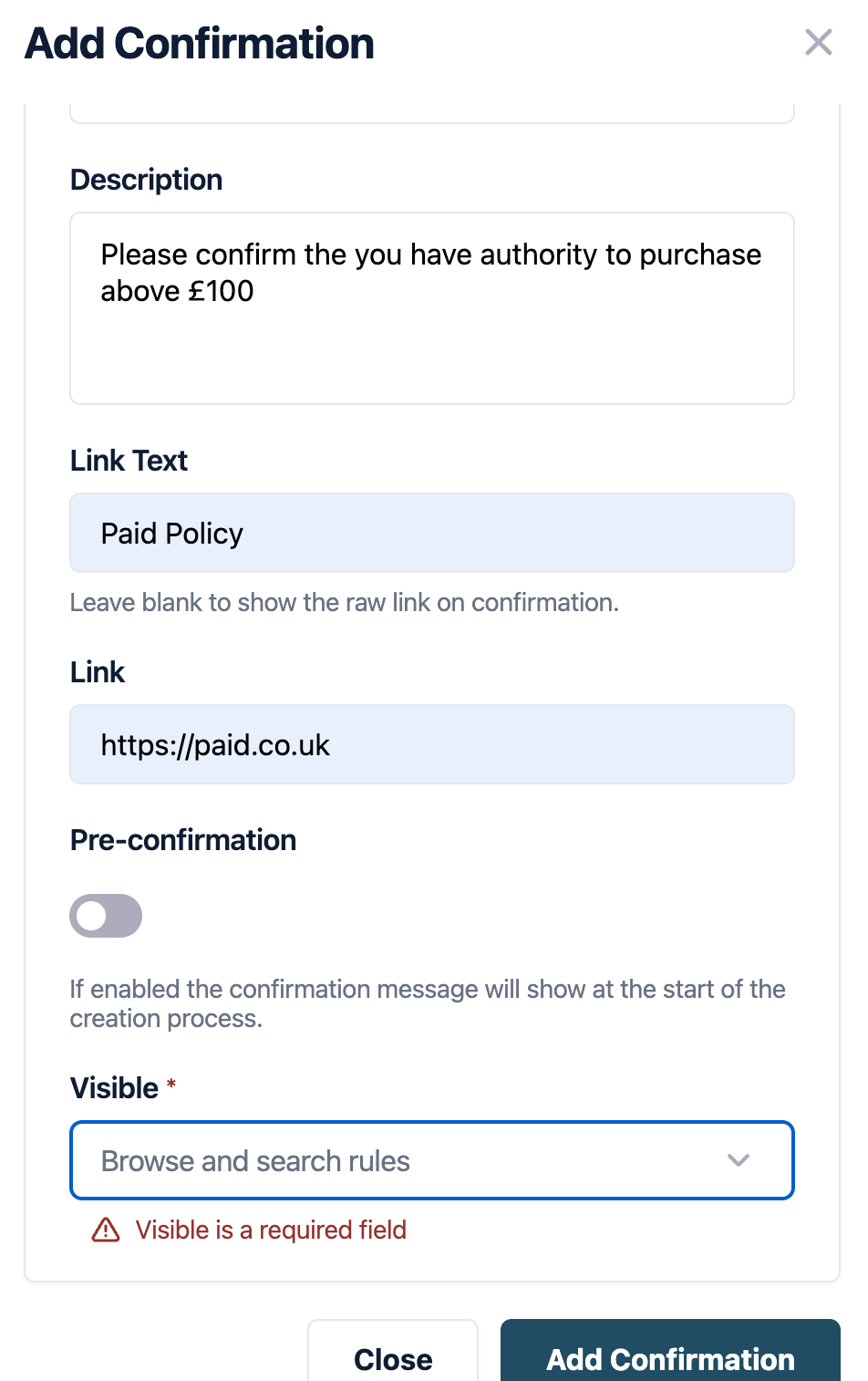 4) From here select “Add Confirmation”, a pop out box will appear on the right hand side of the screen;