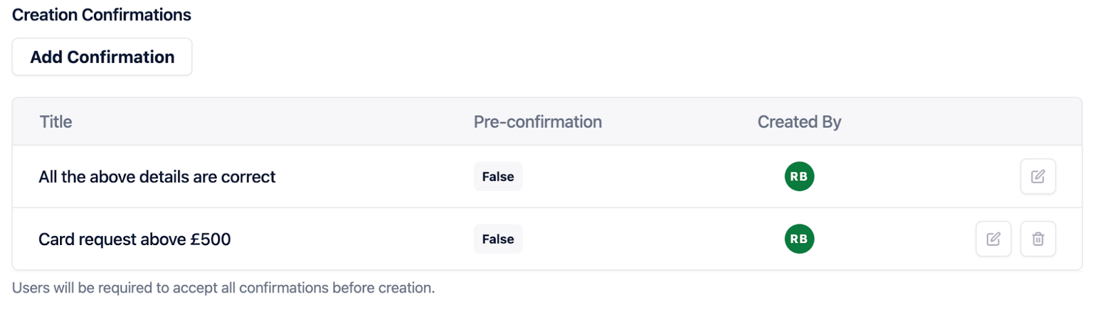 Example: A pre-confirmation might ask the user: "Do you abide by all of our rules before you create the virtual card?"