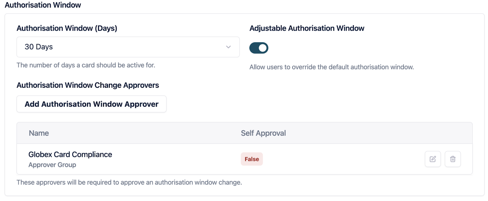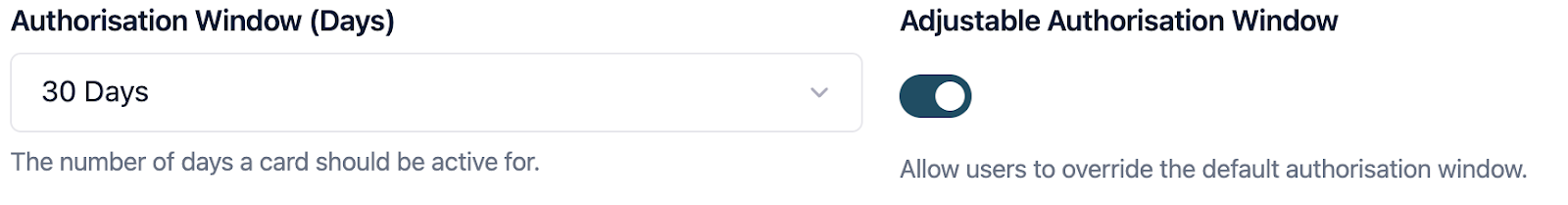 Purpose: The authorisation window controls when a virtual card is active and usable. Adjusting this helps, improve security, prevent unauthorised or late usage, align card use with scheduled purchases or events.