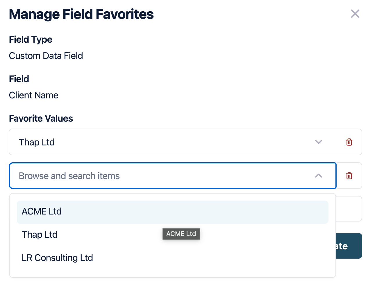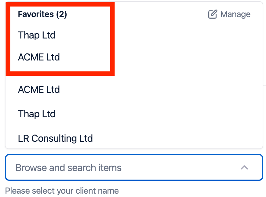 7. The second way that you are able to select “Favorites” would be while creating a Virtual Card. Start the process as normal, depending on what field (Client Name, RAC, UNI, Codes), you have selected “Allow Users Favorites” you will be given the option to “Manage” favorites. For this example we will be using “Client Name”.