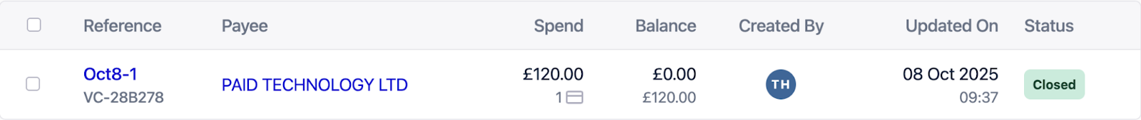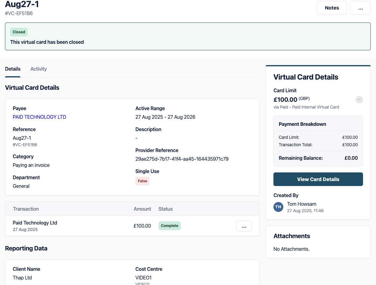1) Go into the list of Virtual Cards, you can navigate to this from the menu on the left hand side;